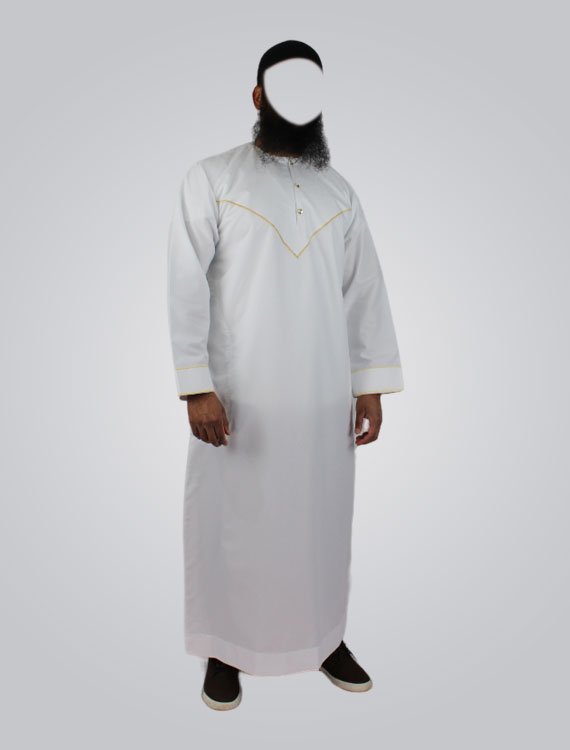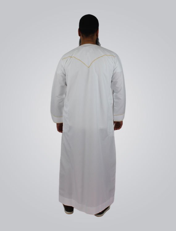 The thobe  is a traditional Middle Eastern garment worn by men. It is a long, loose-fitting robe and features long sleeves. Golden string at chest and back adds a unique look to the thobe.