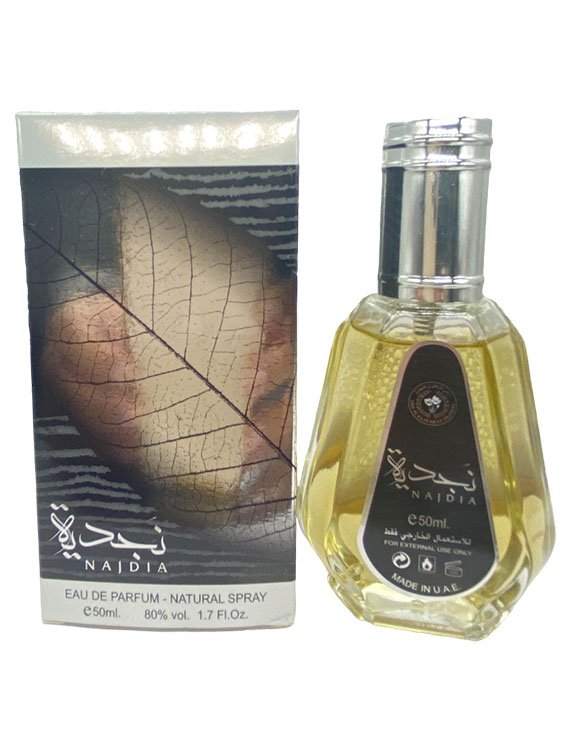 “Najdia” Eau De Parfum Natural Spray is a captivating and luxurious fragrance that captures the essence of Arabian opulence and sophistication. This exquisite scent is designed for those who appreciate the rich and sensual aromas of the Middle East. The top notes of oud, spices, and floral accords create a rich and inviting opening, while the heart notes of rose, saffron, and patchouli add depth and complexity. The base notes of oud, amber, and musk provide a warm and sensual foundation that lingers on the skin with a mesmerizing aura. “Najdia” is a fragrance that is perfect for special occasions or evening wear, making you feel truly luxurious and glamorous. The long-lasting performance and captivating aroma of “Najdia” make it a standout and memorable fragrance that will transport you to the exotic lands of Arabia. It’s a scent that embodies the richness and mystique of the Middle East, leaving a lasting impression wherever you go.