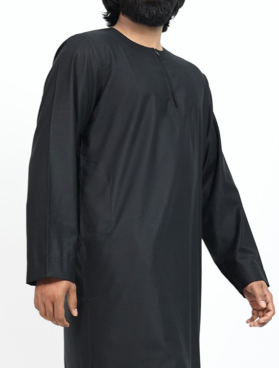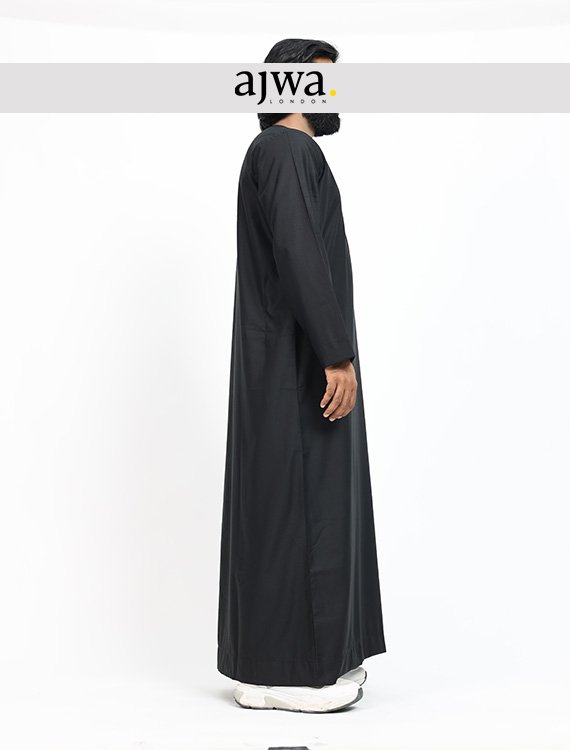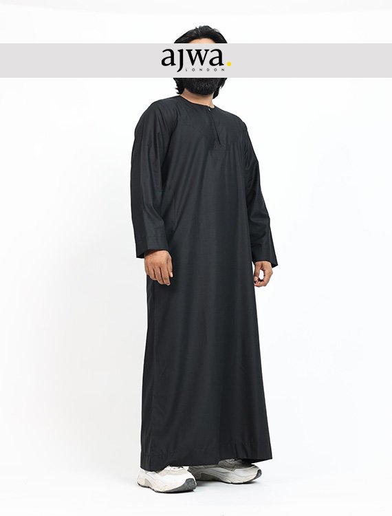 This Ajwa London-Collection thobe for men is made of soft and breathable cotton material and comes in different colours. With a collarless design and a zip front center, it offers a professional and modern look. It also features two pockets for added practicality. The sizes range from 52 to 60, with every size measuring two inches apart in length and width. Made with 70% polyester and 30% viscose, this thobe is both durable and comfortable for everyday wear.