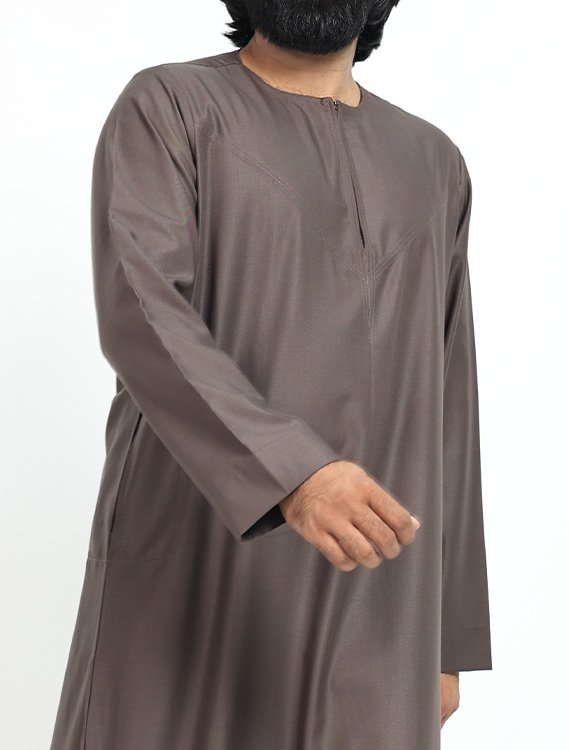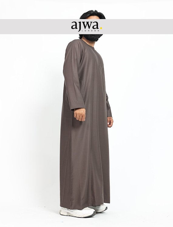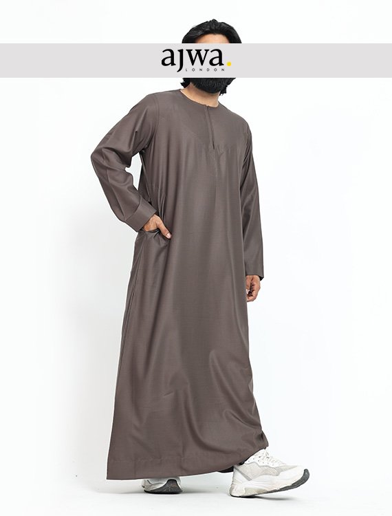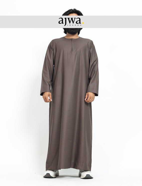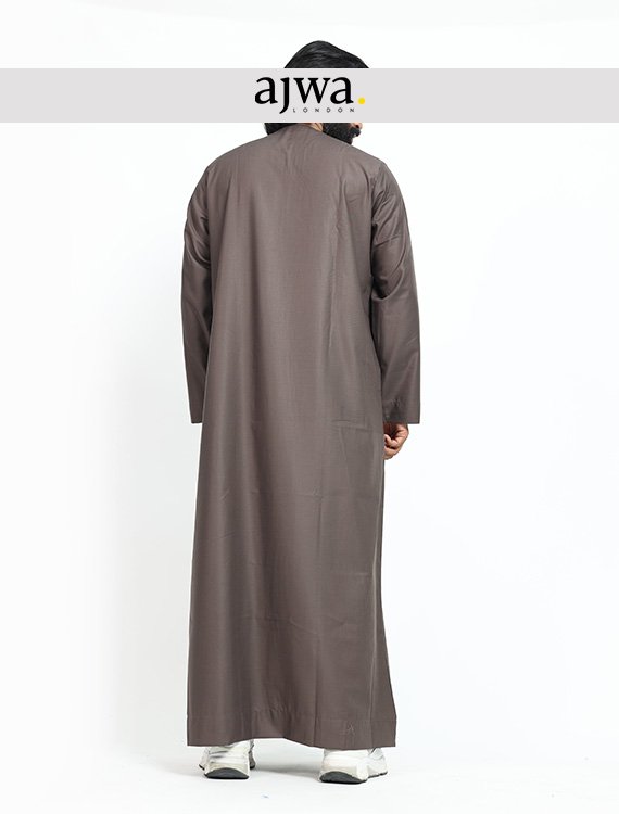 This Ajwa London-Collection thobe for men is made of soft and breathable cotton material and comes in  different colours. With a collarless design and a zip front center, it offers a professional and modern look. It also features two pockets for added practicality. The sizes range from 52 to 60, with every size measuring two inches apart in length and width. Made with 70% polyester and 30% viscose, this thobe is both durable and comfortable for everyday wear.