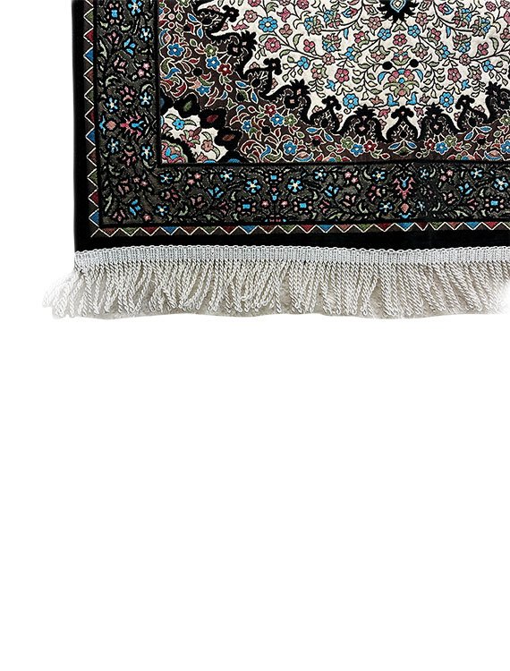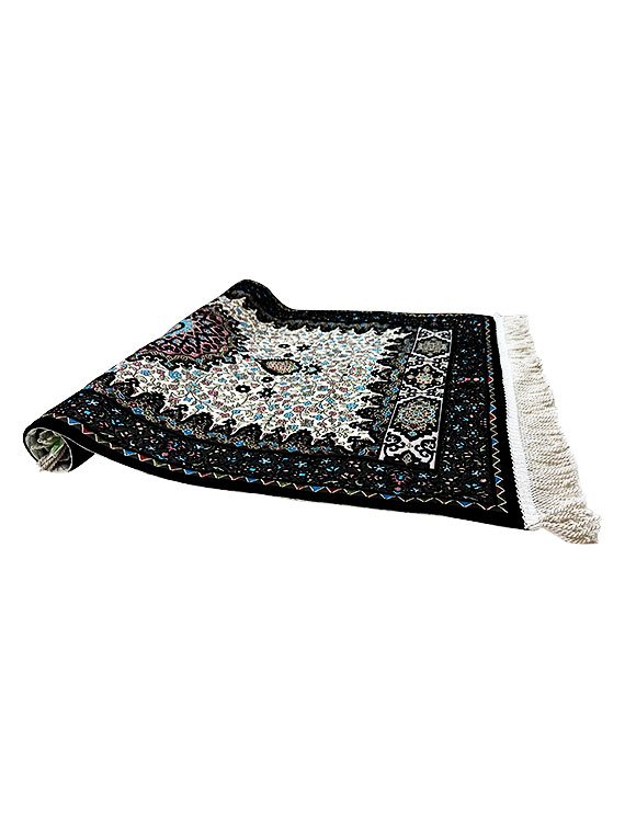 Prayer mats, also known as prayer rugs, are used by Muslims during daily prayers. They typically feature a simple design, with a rectangular shape and a black border outlining the mat. This border serves to highlight the central prayer area, which may be adorned with additional decorative elements or symbols. Prayer mats are often made of materials such as wool, cotton, or silk, and may be embroidered with intricate patterns or calligraphy. The black border is a traditional feature of many prayer mats and serves as a reminder of the sacred nature of the space in which prayer is performed.